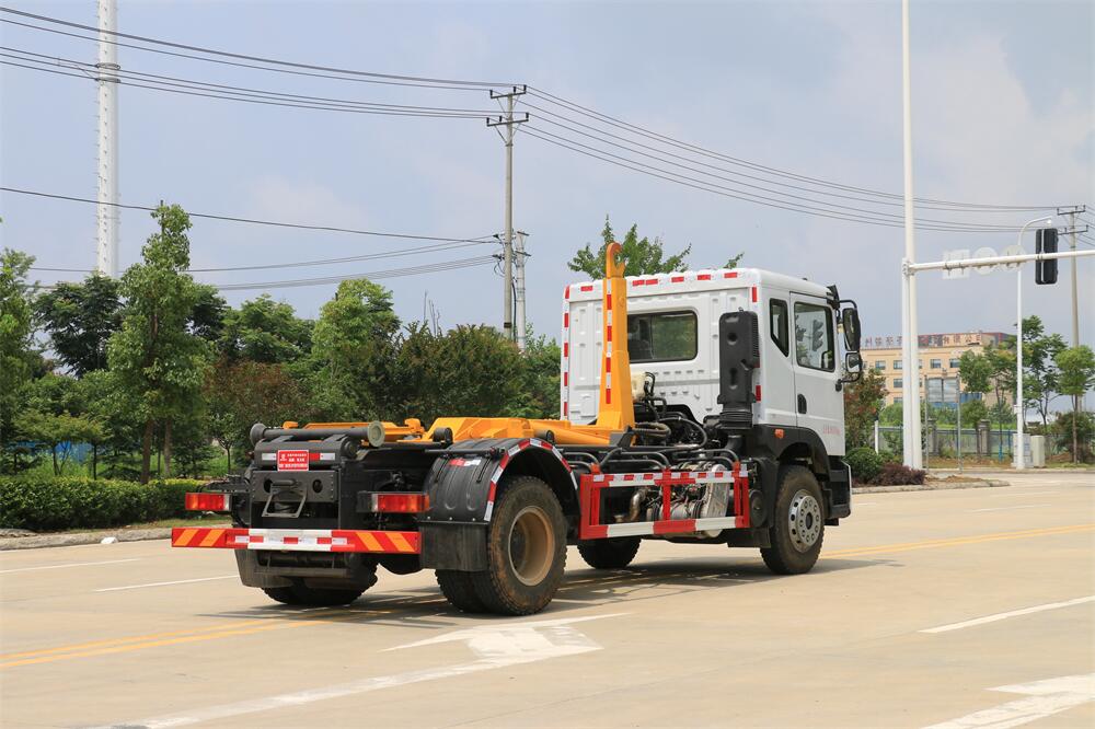 該款鉤臂式垃圾車由液壓系統、操作系統組成。舉升油制缸(1支)系國內知名液壓件廠家生產的雙作用油缸。垃圾廂可自吊上放下,可自行傾倒垃圾,上下一次工作循環時間≤50S。該車的特點是一個車能配多個垃圾廂,能實現一臺車與多個垃圾廂聯合作業,循環運輸,充分提高了車輛的運輸能力。