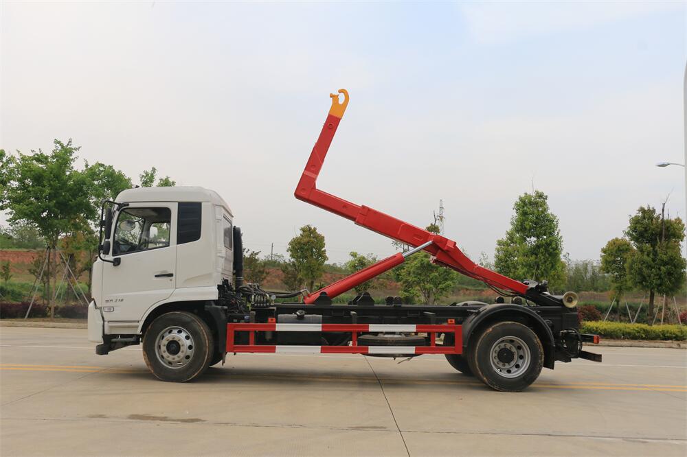 該款鉤臂式垃圾車由液壓系統、操作系統組成。舉升油制缸(1支)系國內知名液壓件廠家生產的雙作用油缸。垃圾廂可自吊上放下,可自行傾倒垃圾,上下一次工作循環時間≤50S。該車的特點是一個車能配多個垃圾廂,能實現一臺車與多個垃圾廂聯合作業,循環運輸,充分提高了車輛的運輸能力。