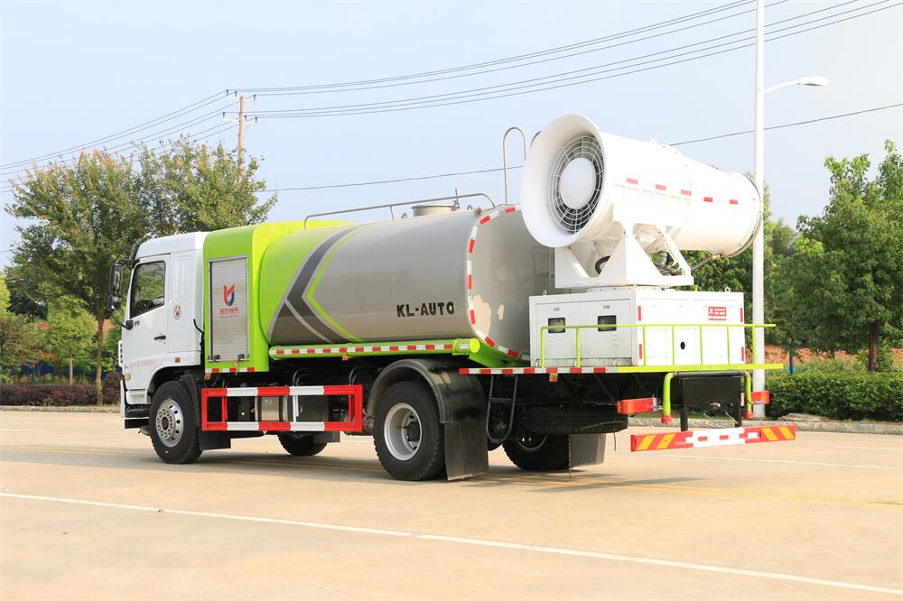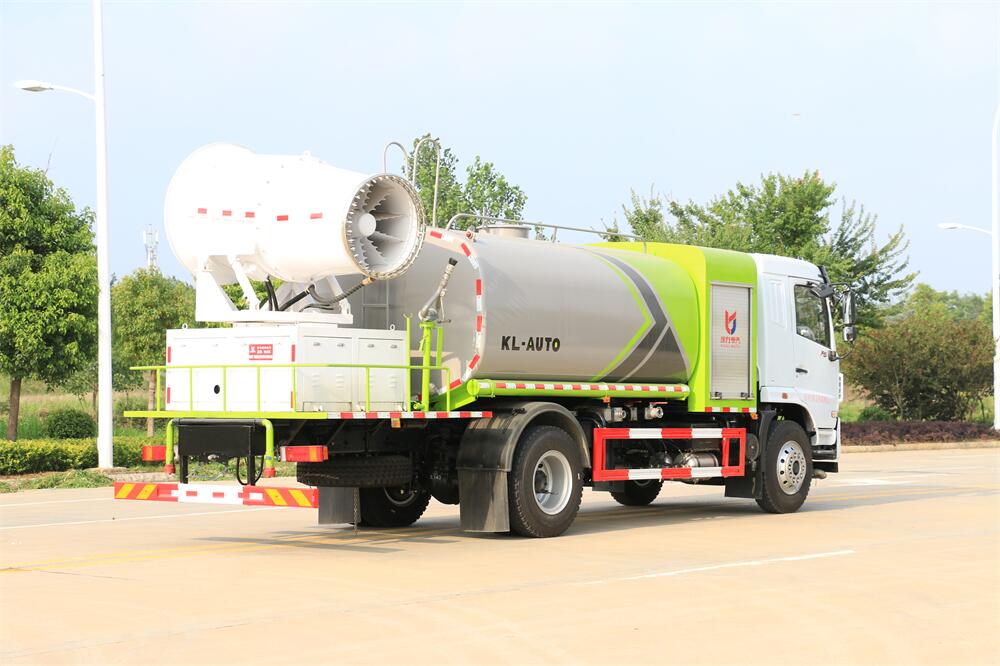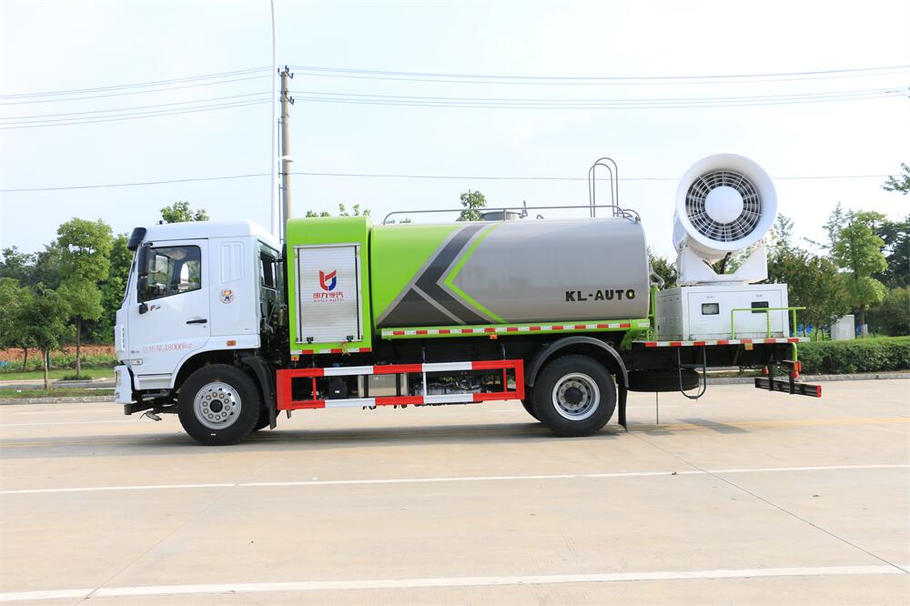 上裝配置:罐體容積為 12立方,選配風(fēng)送式霧炮機組射程30米、40米、50米、60米、80米、100米、120米霧炮,罐體鋼板為4mm碳鋼Q235材質(zhì),罐內(nèi)隔板具有防波作用,以減輕汽車行駛時罐體液體沖擊,罐體及整車外形尺寸按照公告。帶大功率專用灑水泵,泵可自吸自排,整車前沖、后灑、側(cè)噴、帶65消防接口,后平臺配CLW-50、CLW-60、CLW-80、CLW-100、CLW-120型風(fēng)送式霧炮機組;罐體前封頭配大功率柴油發(fā)電機組;前封頭帶水位計,后平臺主管路帶1寸澆花接口,后爬梯。帶兩根輸水管及陰陽端。罐體顏色:銀/灰/綠,罐體兩側(cè)噴“多功能抑塵車”字樣,貼反光標示。